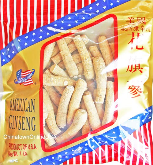 Premium American ginseng roots. Product of USA. Net weight: 1 lb. / bag.